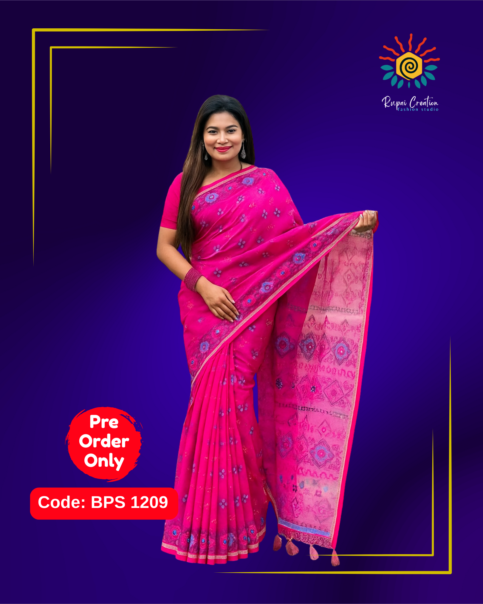 Embrace elegance with this exquisite Pride cotton sharee, handcrafted with traditional hand block prints. The rich hot pink base is intricately adorned with hand block-printed floral and geometric motifs in shades of blue and purple, giving it a striking yet graceful appeal.